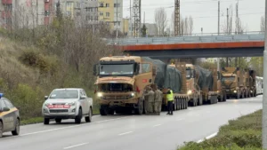 Военен камион с турски обозначителни знаци, част от колона на НАТО, аварира на главния път при изхода на Хасково в посока Димитровград, предаде „Булфото“.