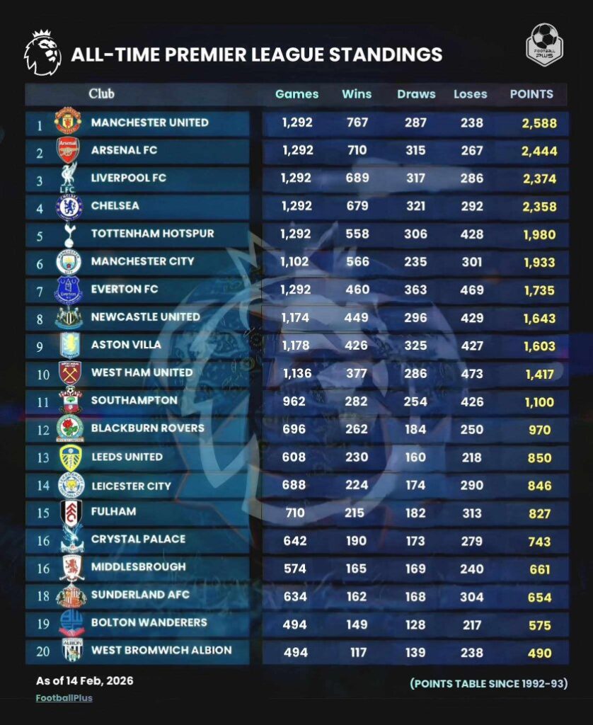 Вечната ранглиста на Висшата лига за периода 1992–2026 г. показва кои са най-успешните клубове в историята на английския елит. От създаването си през 1992 година Висшата лига се превърна в най-гледаното и финансово най-мощното футболно първенство в света. Вечната класация по точки отразява постоянството, титлите, класиранията в топ 4 и цялостната стабилност на клубовете в дългосрочен план.