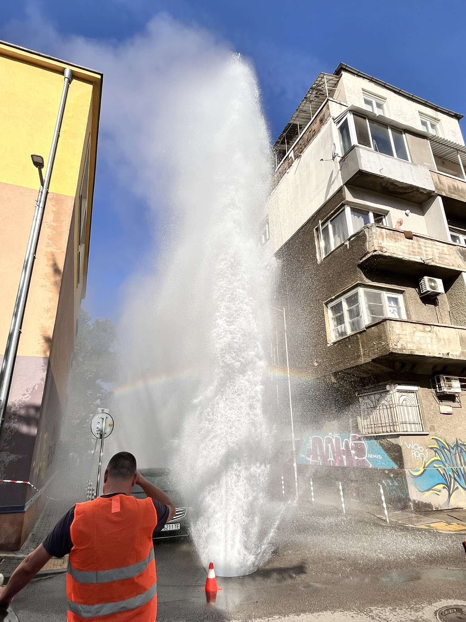 В центъра на София се появи огромен гейзер с вряла вода, изригнал от спукана тръба, както показват видеоклипове, публикувани в социалната мрежа Х. Свидетели съобщават, че водната струя е достигала височина около 20 метра.