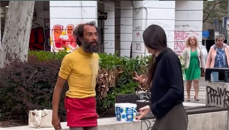 Изперкалият мъж остави минувачите без думи със скандалната си визия и поведение. Това стана ясно от видео във Фейсбук, на което той танцува бос с непознато момиче, облечен с червена пола, сив чорапогащник и жълта тениска.