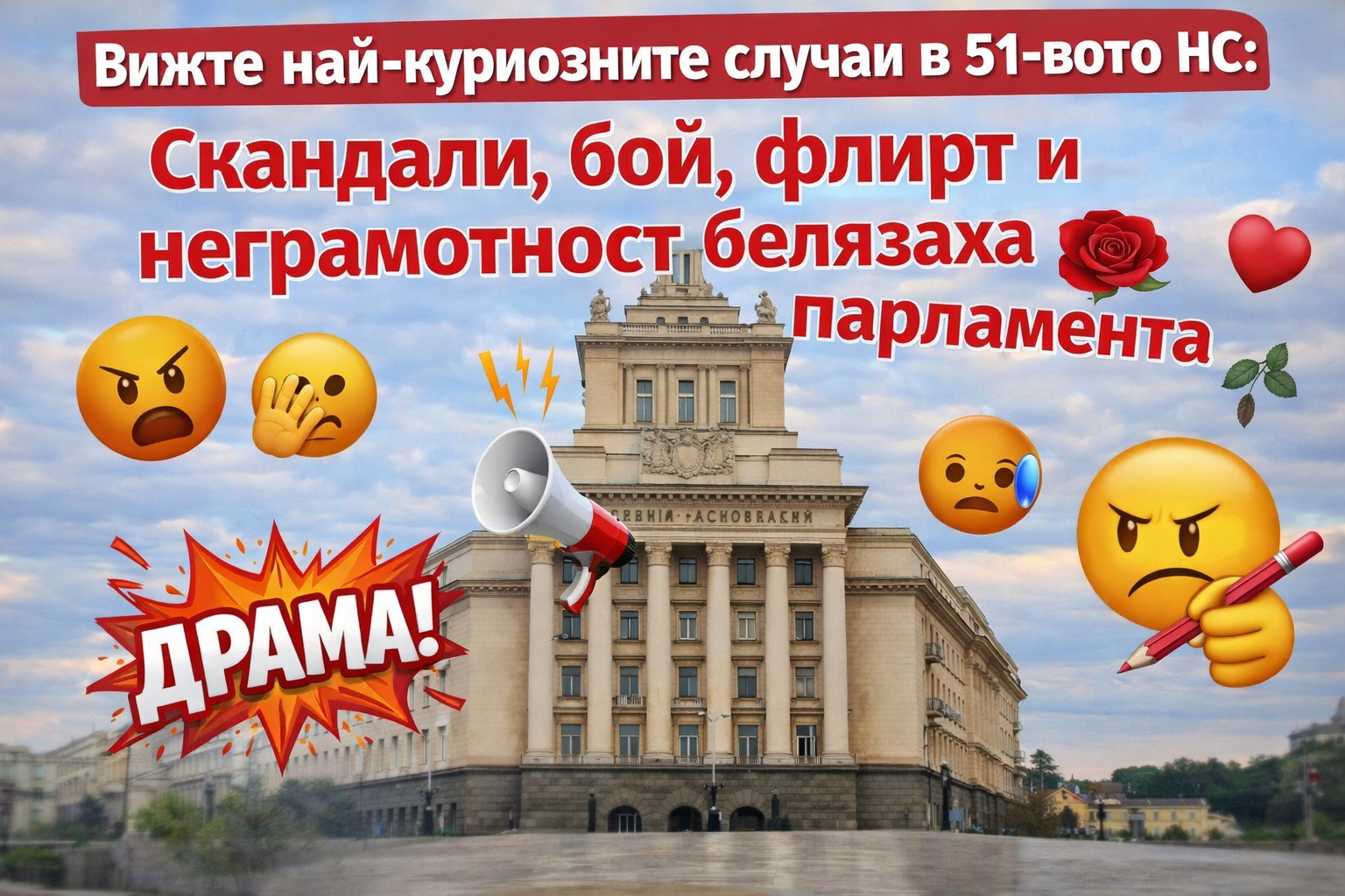 След 16 месеца, които се усещаха като 16 години турско робство за разума, този парламент най-сетне затвори врати. Истината е, че 51-вото НС не беше законодателен орган – то беше най-скъпо платеният стенд-ъп клуб в България, продуциран от егото на народните представители и режисиран от вътрешните им драми. Само че вместо да се смеем на вицове, ние плакахме над данъците си, докато гледахме как народните избраници се дърпат за перчемите.