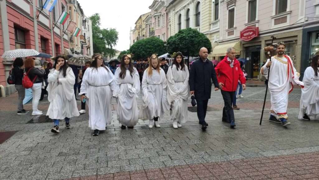 С традиционното Дионисово шествие започна и тази година 10-то юбилейно издание на фестивала „Вино и гурме“. Бог Дионис, придружен от кмета на Пловдив Костадин Димитров и председателя на Съвета по туризъм Любозар Фратев, поведоха шествието, което под звуците на българска ръченица премина през главната улица и стигна до площада пред Туристическия информационен център в Стария град.
