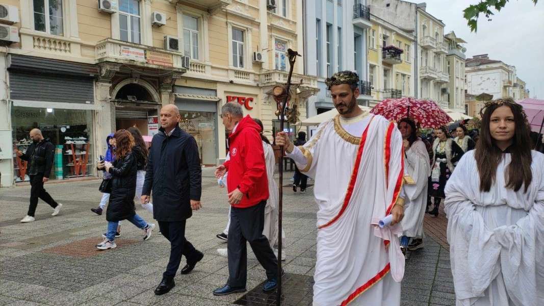 С традиционното Дионисово шествие започна и тази година 10-то юбилейно издание на фестивала „Вино и гурме“. Бог Дионис, придружен от кмета на Пловдив Костадин Димитров и председателя на Съвета по туризъм Любозар Фратев, поведоха шествието, което под звуците на българска ръченица премина през главната улица и стигна до площада пред Туристическия информационен център в Стария град.