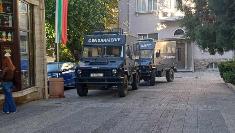 Пред входа на общината са разположени двама жандармеристи, които не допускат влизане, а отстрани са спрени две специализирани коли на жандармерията. Униформени има и пред двата входа на сградата.