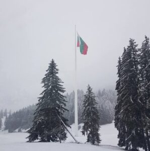 Сред снежния пейзаж гордо се развява и българският трибагреник на връх Рожен, допълвайки зимната идилия.