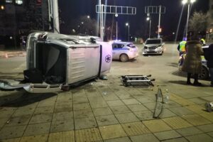 По данни на полицията, произшествието е възникнало, след като лек автомобил „Хонда“ е отнел предимството на движещия се по булеварда джип „Мицубиши“. В резултат на удара джипът се е обърнал, а по предната част на другия автомобил също са нанесени материални щети.